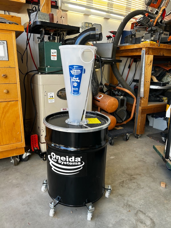 This is the new upgraded Dust Deputy. The cyclone is larger, and the collection bin is steel this time. At least the fire will be contained if it ever happens again!