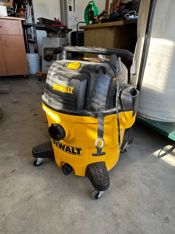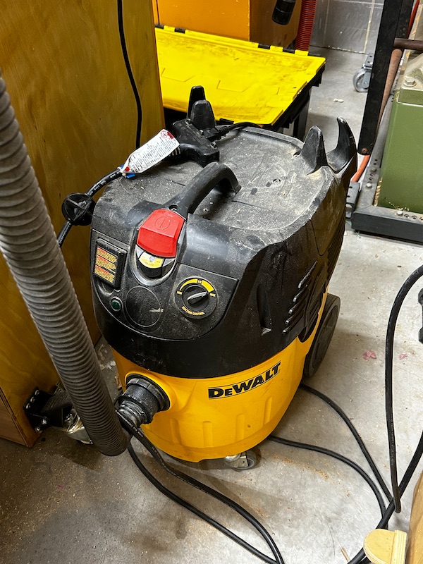 The DeWalt shop vac is dual-purpose: general shop cleanup and dust collection with the Oneida Dust Deputy at the router station.