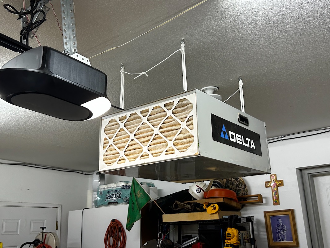 The air cleaner sits at the top of the shop, and I occasionally remember to turn it on!! :) For the most part, I am rarely in the shop with the double garage door down, so it gets minimal use!