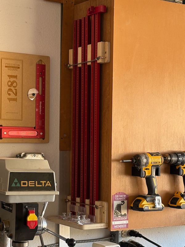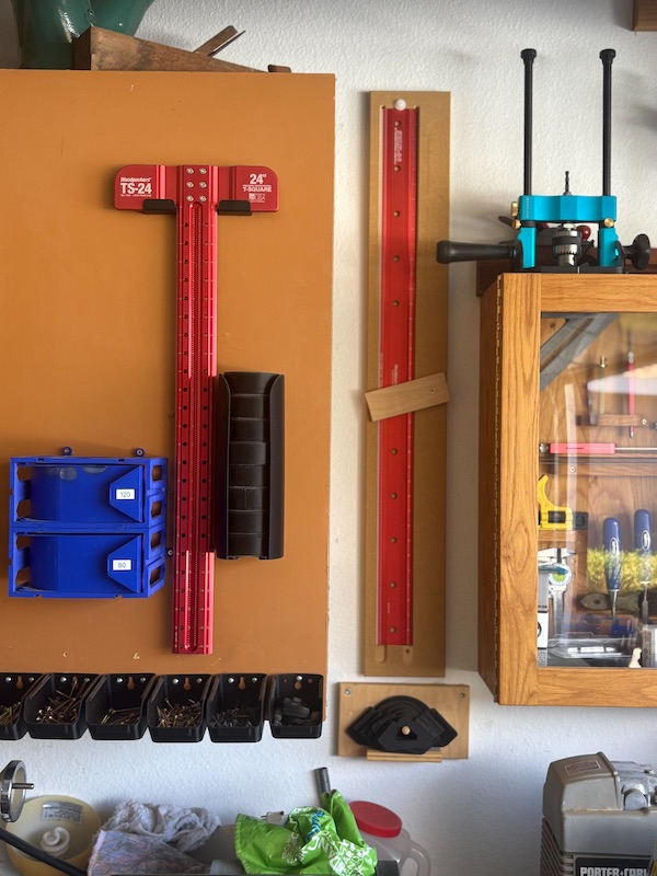 The T-Square hangs right next to my bench. When laying out sheet goods, this tool is very handy for ensuring that my tracksaw is lined up square to the side of the sheet goods. I make oversized cuts here and then cut final dimensions on the tablesaw, and it is nice to know that the first rough cut is straight and parallel!