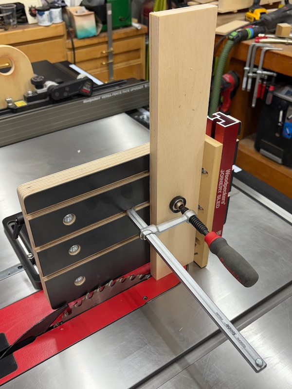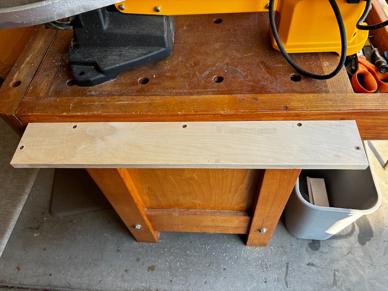 The 1" Baltic birch trim router table has two slots that clamps can slide into and attach to this small shelf I installed on the end of my workbench.