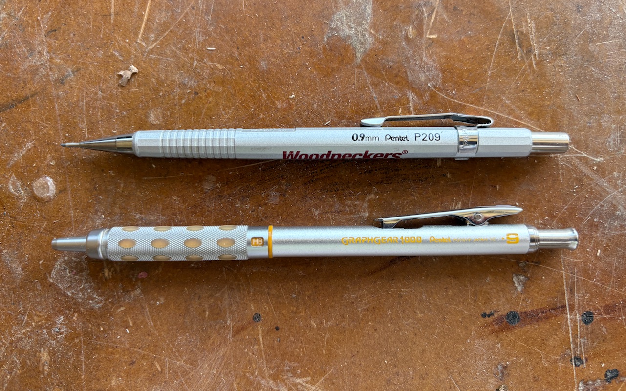 The Woodpecker pencil came in the Christmas gift package. Compared to the Pentel version, it is much lighter, and the lead does not detract at a click. But it sits on my bench, and I find myself grabbing it half the time to make a quick mark. .9 mm is the way to go, in my opinion. The lead has enough girth that it does not snap off as easily as the .5 mm thickness, and still makes a crisp line for layout.
