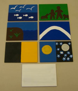 These seven 5.5” x 8” x 1/4” “cards” are used in telling the story of creation. These cards are made from 1/4” hardboard and all the edges are rounded over with a 1/8” radius bullnose bit.