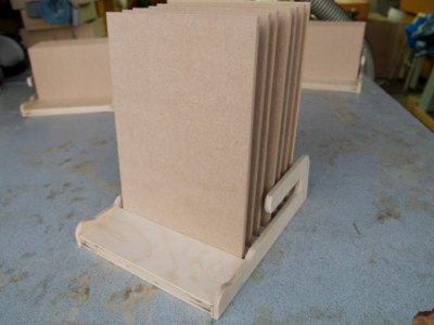 The 8”x11” cards of the Faces of Easter are made from 1/4” hardboard. The rack is Baltic Birch. The slots are cut at 5 degrees so the lay back.