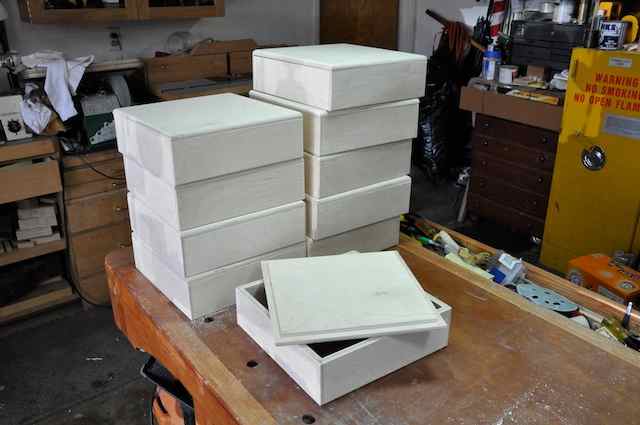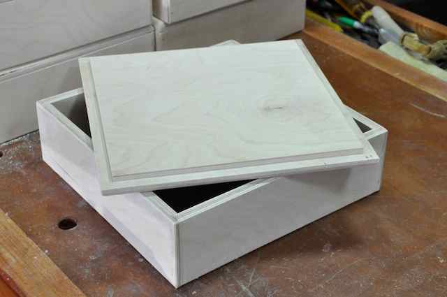 Our boxes are 11” square and about 3” high, made from 1/2” Baltic Birch sheet stock. The top is ¾” Baltic Birch and finished with a 1/4” radius round over, and the inside of the top is rabbeted so it fits squarely on the box.