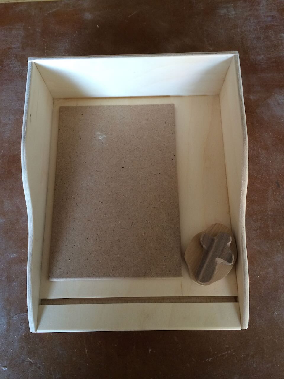 The tray is 8"x10" and is made from Baltic Birch sheet stock. The sides are ⅜" and the floor is ¾". The ¼" slot in the front is beveled back 5 degrees to present the card. The 1/4" hardboard saint card is 5.5"x6".