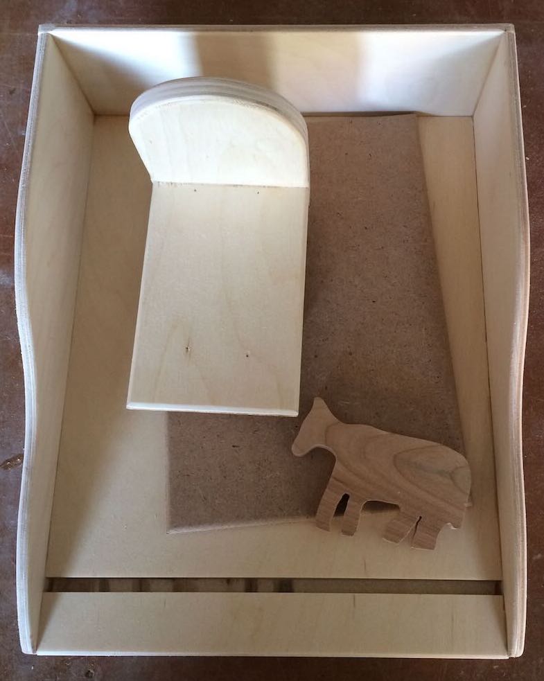 Saint Teresa includes a small bed made for Baltic Birch and a (strangely shaped) donkey from American hardwood.
